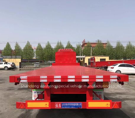 Wosheng Flatbed-aanhangwagens worden gewoonlijk gebruikt voor het vervoer van 20FT/40FT/45FT container.hoe beter de capaciteit om super hoge ladingen te vervoeren en bovenliggende obstakels te passerenDe belasting van de platte halve aanhangwagen verschilt ook naargelang van het aantal assen en de afmetingen van de banden.en het laadbereik is tussen 30-80 ton.
